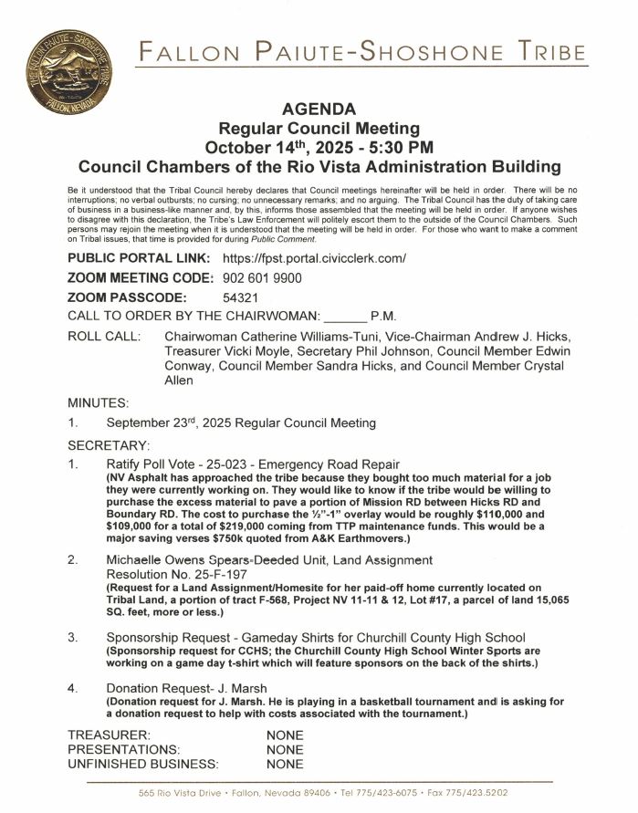 October 14 @ 5:30 pm - 7:00 pm Regular Council Meeting Agenda – October 14, 2025 FPST Administration Building - Council Chambers 565 RIO VISTA DR, Fallon, Nevada, United States